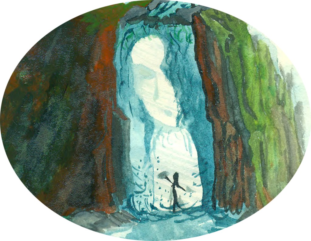 He entered, knee deep in seawater, his spear drawn. Waves beat ceaselessly against the rocks filling the cavern with a briny mist. An unknown source of light from within the grotto produced an eerie efflorescence of teal and purple. He waded in slowly as the dragon lurked in the darkness.